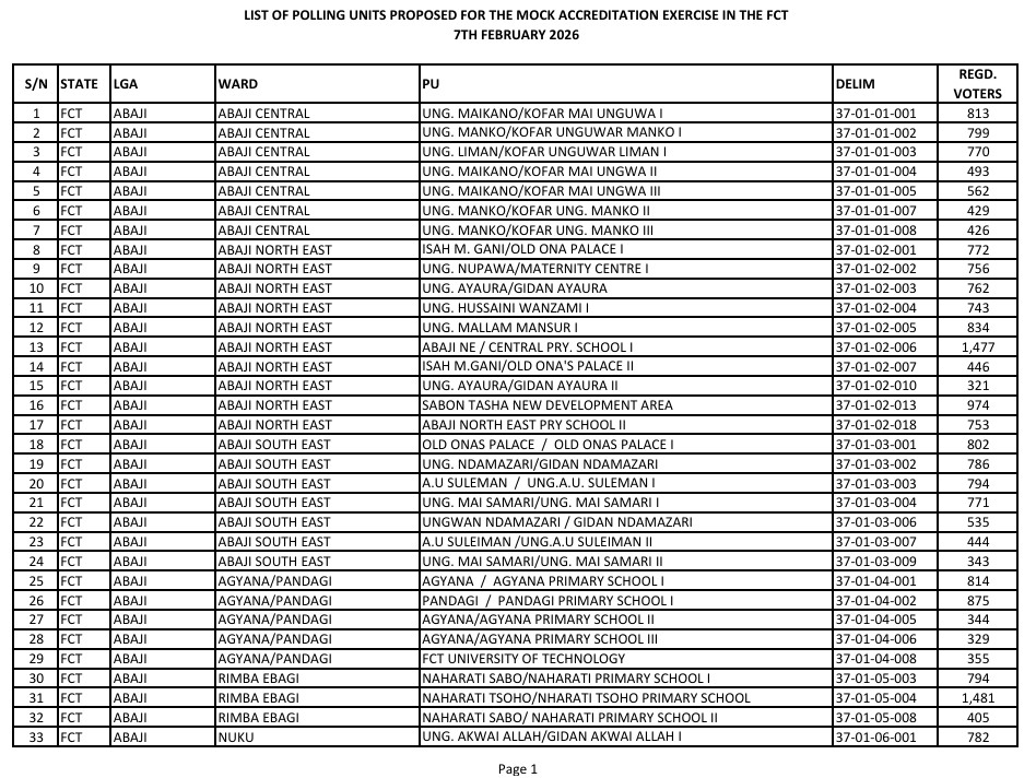 FCT AREA COUNCIL MOCK ELECTIONS HOLDS 7TH FEB, 2026 -DESIGNATED POLLING UNITS FOR THE EXERCISE