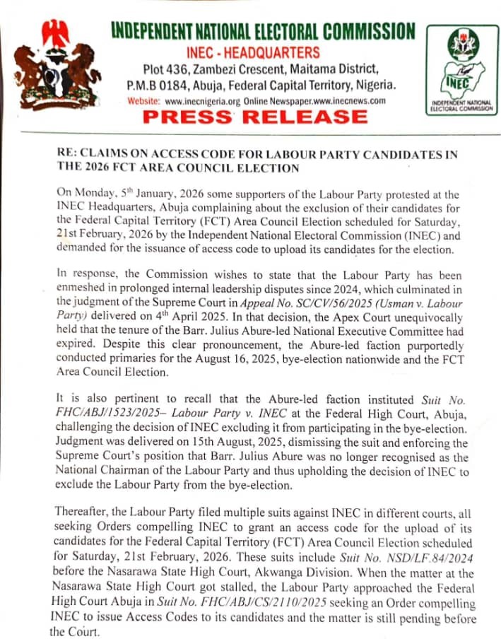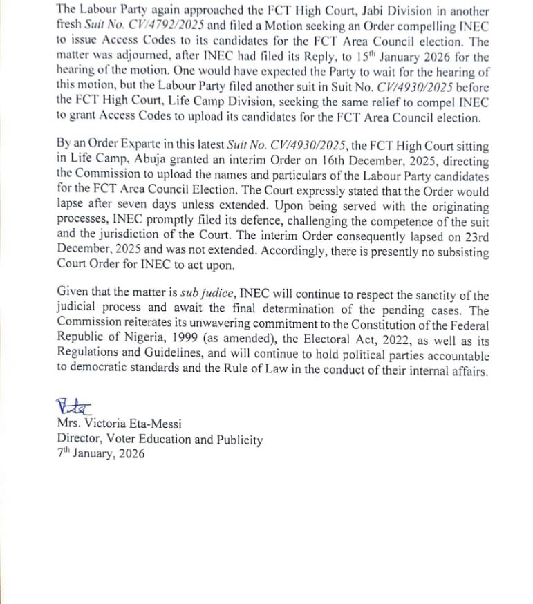 INEC RESPONDS TO CLAIMS FROM LABOUR PARTY ON CANDIDATE’S EXEMPTION FOR THE 2026 FCT AREA COUNCIL ELECTIONS