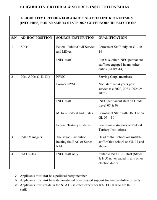 INECPRES Ad-hoc Staff recruitment To view eligibility for the 8th November,2025 Anambra Governorship Election, Click Below.