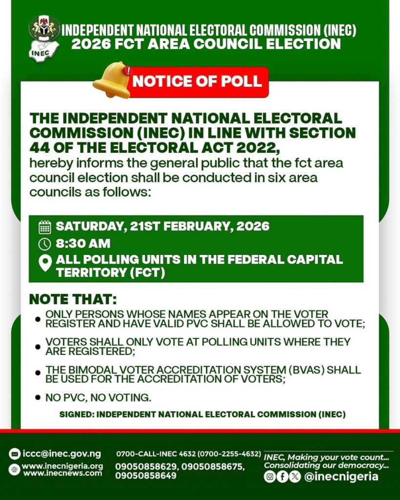 NOTICE OF POLL: 2026 FCT AREA COUNCIL ELECTION