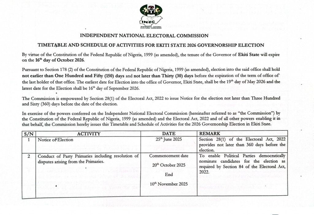 TIMETABLE AND SCHEDULE OF ACTIVITIES FOR EKITI AND OSUN STATES 2026 GOVERNORSHIP ELECTION EKITI STATE OSUN STATE