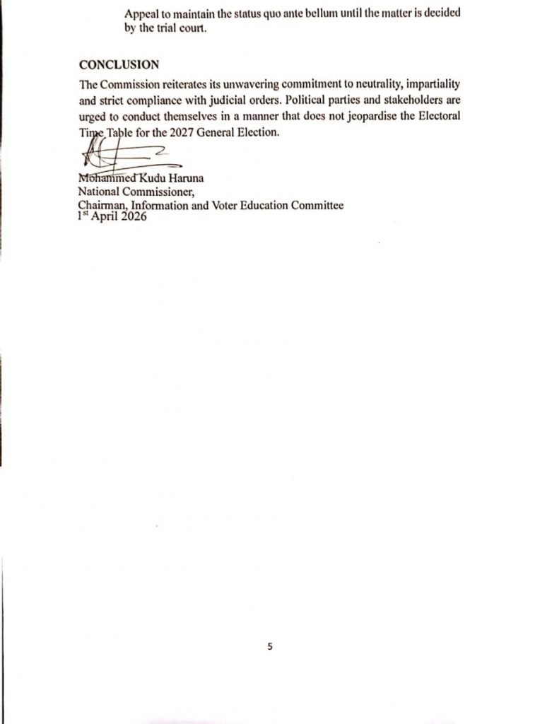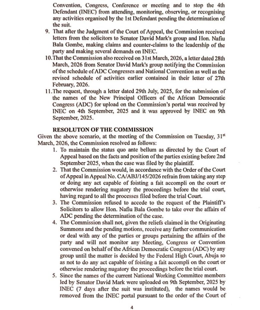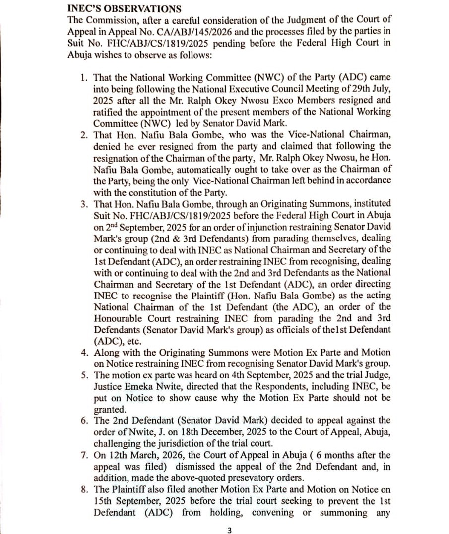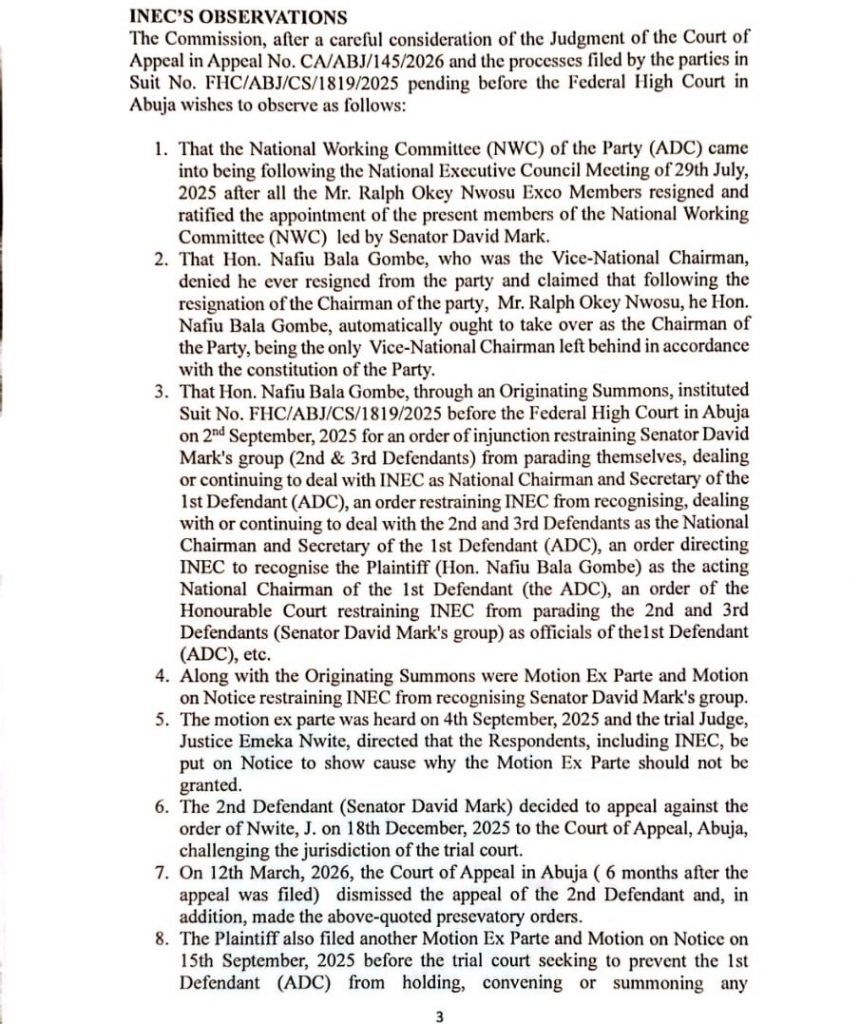 ADC MATTERS:INEC’S POSITION ON THE COURT OF APPEAL’S DECISION IN APPEAL NO. CA/ABJ/145/2026