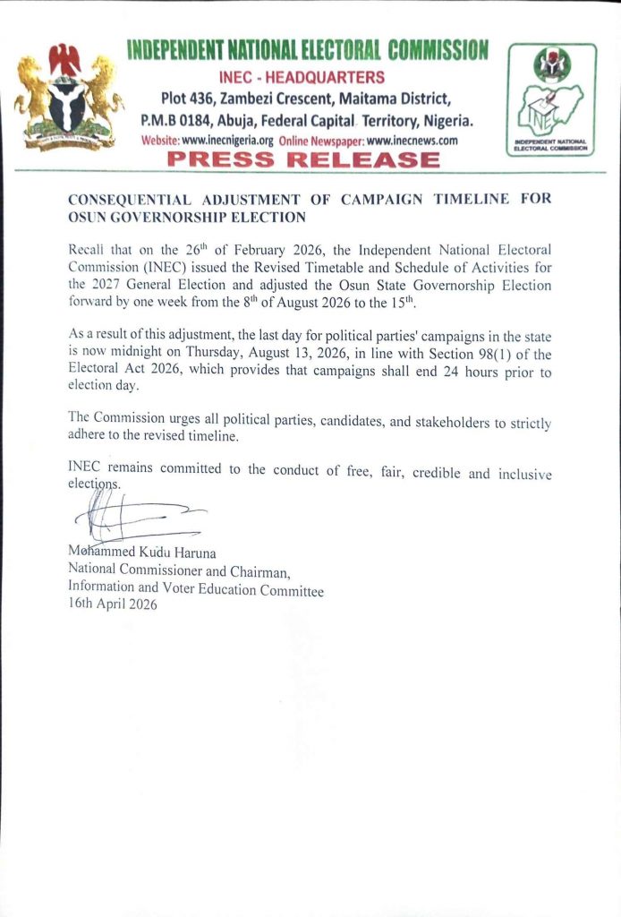 ADJUSTMENT OF CAMPAIGN TIMELINE FOR OSUN GOVERNORSHIP ELECTION