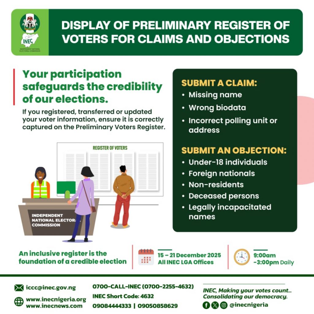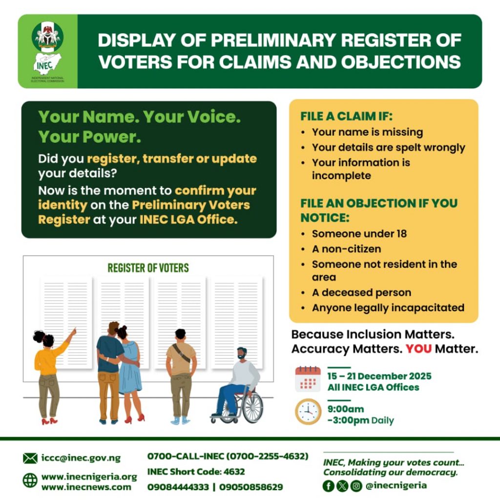 DISPLAY OF PRELIMINARY REGISTER OF VOTERS FOR CLAIMS AND OBJECTIONS NATIONWIDE