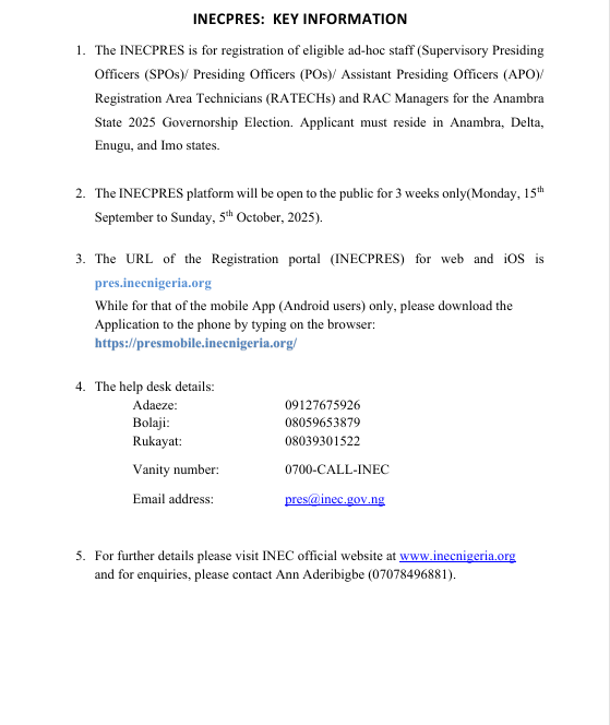 INECPRES Ad-hoc Staff recruitment To view eligibility for the 8th November,2025 Anambra Governorship Election, Click Below.