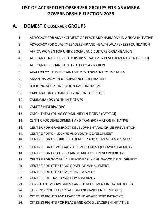 LIST OF ACCREDITED OBSERVER GROUPS FOR ANAMBRA GOVERNORSHIP ELECTION 2025