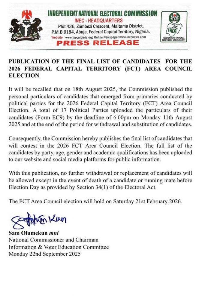 LIST OF CANDIDATES FOR THE FEBRUARY 2026 FCT AREA COUNCIL ELECTIONS ABAJI CHAIRMAN AND VICE ABAJI COUNCILLORSHIP AMAC CHAIRMAN AND VICE AMAC COUNCILLORSHIP BWARI CHAIRMANSHIP AND VICE BWARI COUNCILLORSHIP GWAGWALADA CHAIRMANSHIP AND VICE GWAGWALADA COUNCILLORSHIP KUJE CHAIRMANSHIP AND VICE KUJE COUNCILLORSHIP KWALI CHAIRMANSHIP AND VICE KWALI COUNCILLORSHIP